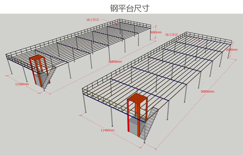 鋼平臺(tái)是用單支支柱做主支撐,用主次梁做樓面支撐,將倉(cāng)庫(kù)分為上下2~3個(gè)空間的一種獨(dú)特貨架。貨架平臺(tái)是在重型貨架頂部搭建一鋼平臺(tái),集貨架與平臺(tái)一體的鋼結(jié)構(gòu)。分隔出的空間可做存儲(chǔ)或辦公用。