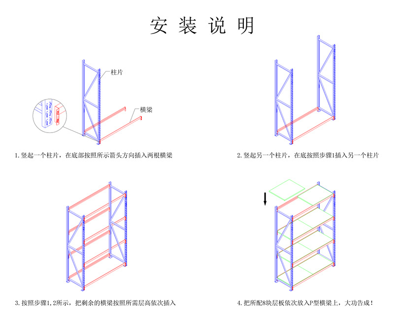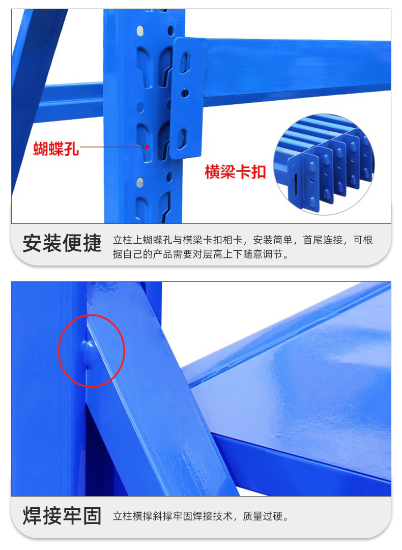 輕型貨架屬于擱板式貨架,承重范圍在100kg到300kg每層,主要是由立柱、斜撐、橫撐、橫梁和層板所組成,其中立柱、斜撐和橫撐可以組成立柱片,輕型貨架的立柱片通常在生產(chǎn)時已經(jīng)焊接好了,無需后續(xù)組裝。